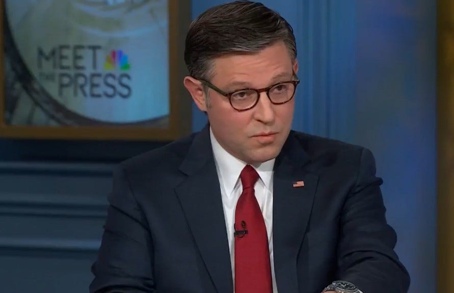 Meet The Press’s Kristen Welker asked Johnson, “Is it healthy for this country’s democracy — for the sitting president — to be questioning the 2020 election, five years ago, something, claims that have been deemed to be false, again now, that he lost?”